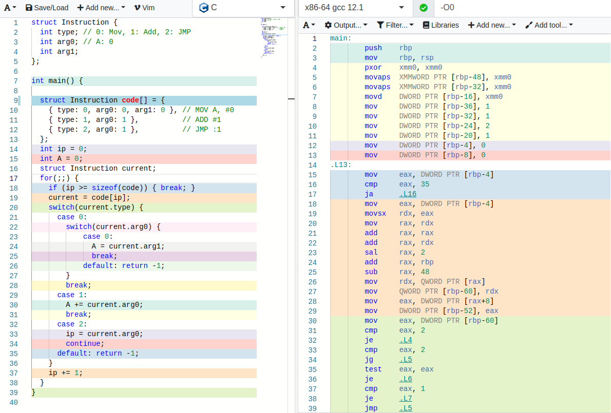 struct Instruction {int type; // 0: Mov, 1: Add, 2: JMPint arg0; // A: 0int arg1;};int main() {struct Instruction code[] = {{ type: 0, arg0: 0, arg1: 0 }, // MOV A, #0{ type: 1, arg0: 1 }, // ADD #1{ type: 2, arg0: 1 }, // JMP :1};int ip = 0;int A = 0;struct Instruction current;for(;;) {if (ip >= sizeof(code)) { break; }current = code[ip];switch(current.type) {case 0:switch(current.arg0) {case 0:A = current.arg1;break;default: return -1;}break;case 1:A += current.arg0;break;case 2:ip = current.arg0;continue;default: return -1;}ip += 1;}}