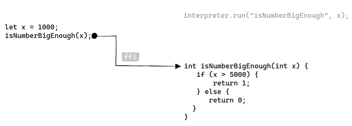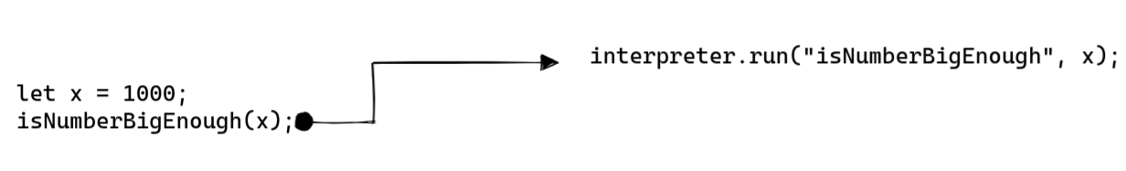 الآن ما یک اشاره گر داریم به تابعی که میخواد تابع مارو Interpret و اجرا کنه. اگه یک تابعی در زبان هاستمون که مثلا اینجا C هست نوشته باشیم که کارش دقیقا همین isNumberBigEnough هست و این اشارهگر رو به اون تغییر بدیم، دیگه لازم نیست از Interpreter برای اجرا این تابع استفاده کنیم.
